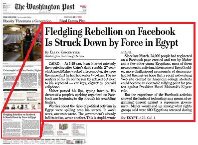 This morning I picked up my Sunday-morning Post and saw the story, “Fledgling Rebellion on Facebook Is Struck Down by Force in Egypt,” right on the front page, which means that across Washington this morning, and other capital cities through clipping services, many in the foreign policy elite and punditocracy may be reading for the first time about the Web 2.0 facet of these events.