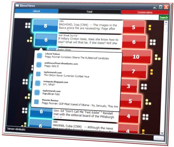 Simple but surprisingly powerful examples are already appearing, as in the Microsoft Research “Blogosphere Early Warning System” or BLEWS, which was unveiled in prototype at the 2008 TechFest and may go live during this presidential election. Here’s a screenshot of BLEWS; intelligence analysts can think of it as an advanced OSINT tool, consuming web-scale social media and blog content.  BLEWS screenshot BLEWS semantically identifies political blogposts, ascribing a left-leaning or right-leaning interpretation.  it then extracts and mines all links to news articles, applies an “emotional charge” classifier and a de-duplication algorithm to related articles, and finally produces a visualization of the volume and semantic relationship of the articles in near-real-time.  Nifty! A personal disclosure: my happiness at the Powerset acquisition isn’t just because of the technology it brings to Microsoft. In fact, when I was preparing to leave government service last year, I was approached by the startup about their position of VP of Engineering.  I had some fascinating discussions and love the company, the technology, and Barney Pell – but I felt I was a better fit as a generalist at Microsoft.  Well, what do you know – happy endings!  E pluribus unum 🙂    Email this post to a friend