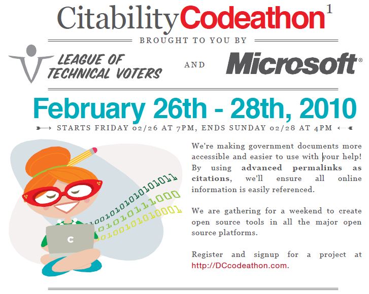 The Codeathon is being hosted at the Microsoft Chevy Chase office, and all the necessary logistics and details are at www.Citeability.org.